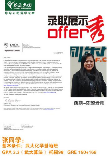这位同学是新东方的GRE学员。第一次来找我的时候,还在痛苦的杀G路上。本来我以为他会像大多数已经学了三四年基础学科的学生一样,对科研不再感兴趣。他依然坚持将来想从事科研工作,于是我们定下来主申化学博士,以化学硕士保底的方案。他的各项条件都不算太出众,3.3的GPA在武大化院也只是一个中等的成绩,更遑论全国那么多的名校申请者。托福不到100,GRE不到320。有论文,但还未发表,而且级别不算太高。我们根据每个学校的特点,制作出各自针对性的文书,并进行了套磁工作。Emory面试前,我们与他一起做了充分的准备。可能会问到哪些问题,应该如何回答。如何解释自己的劣势等。面试中流畅优秀的表现,赢得了Emory化学系教授们的认可,面试后第三天就来了offer。收到这个好消息说,这位同学非常惊喜,他说:武大化院只有两年前有一个学长申到过Emory,但他是连续两年的国奖获得者。没想到自己也能申到,非常开心。