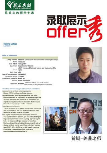 申请经历:出于对材料工程这一专业方向的热爱,结合自身优势与学术背景,留学顾问姜莹老师帮学生推荐了若干所适合的学校及专业,经过综合评估最终选定五所学校申请。申请期间,文书顾问与学生当面沟通交流,在深度了解学生的情况后,量身制定了一套文书方案,经过双方确认后递交申请。由于学生早规划、早申请,在帝国理工11月份开放申请的时候就将准备好的申请材料递交出去,经过两个月的等待,收到了帝国理工的录取信!~