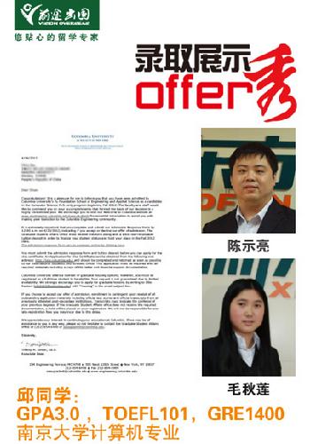 我刚见到这位同学的时候,觉得是个典型的工科男生,低调,腼腆还有点小幽默。他本科所就读大学是一所国内排名前5的名校,因而在选校方面也是把目标盯在了美国名校上,要求专业排名和综合排名都在前30。就他的T/G成绩而言,这样的目标是合理的,但他的GPA勉强刚到3.0,离名校动辄3.5的要求还有一段距离。在申请阶段,我们围绕学生的创新意识和丰富的实验室经历来创作文书,向学校陈述了他对计算机专业的理解以及对整个行业发展趋势的关注。在被Upenn以GPA太低为理由拒掉以后,我们没有灰心,而是继续积极和其他学校保持联系。大四上学期成绩出来以后,主动向学校补充新的成绩,并提交最近参与的项目进展报告。经历了五个月的漫长等待,这位同学终于收到纽约大学和哥伦比亚大学的录取!