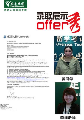 最终结合她入学的时间,我们帮她拿到设计类专业排名非常高的蒙那什大学录取。蒙那什大学建立于1961年,是澳大利亚八所名校之一。2014年美国QS排名为全球第61名。