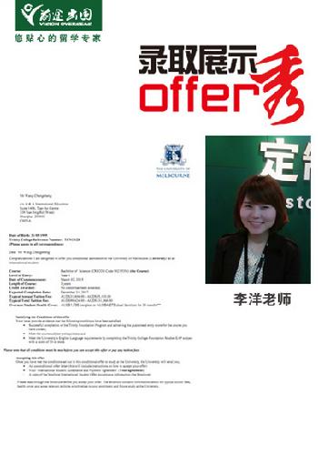 语言培训还没有结束的情况下,就拿到雅思6.0的高分,作为一位高中生,只培训了1个多月的语言是非常难得的。再次证这位同学是非常有学习能力,优秀的学生。2013年8月,我们向新南威尔士大学和墨尔本大学递交了申请,2013年10月,同时拿到两个学校的录取。最终,这位同学选择了自己梦寐以求的墨尔本大学,并将于2014月1月开始他的留学生涯。