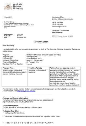 2013年1月,我们向澳国立大学和悉尼大学递交了申请。2013年3月,悉尼大学便发来了预录取,随后两周,澳国立大学也发来预录取。6月份,学生的高考成绩成绩是620分,完全符合两所大学的入学要求,学生于2013年7月顺利入学。