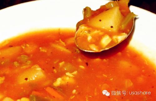 大家可能比较熟悉波士顿地区的新英格兰蛤蜊汤(New England Clam Chowder)奶白色的汤汁浓郁鲜香。可知纽约也有自己的蛤蜊汤,最早叫做“Coney Island Clam Chowder”或“Fulton Market Clam Chowder”最早是由意大利裔的美国人发明的,他们坚持将西红柿放入蛤蜊汤内,红彤彤的纽约蛤蜊汤酸酸甜甜,风味十分独特,里面还有土豆粒和白洋葱。