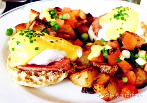 Eggs Benedict是美式经典早餐之一,与华夫饼、蛋饼等齐名。它是纽约最具代表性的早点之一。以英式松饼(English Muffin)做底,上面平铺着类似温泉蛋似的煮蛋,加拿大培根肉Bacon,(有时会放上熏三文鱼肉),再加上美味的蛋黄酱(hollandaise sauce),用餐刀轻轻划开娇嫩的蛋白,暖暖的蛋液就会顺势留下来,透过培根的焦香与浓郁的蛋黄酱汇合,一起浸湿外酥里软的松饼。一份温情十足而又口感丰富的纽约式早餐开启了一整天的美好心情。