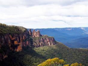 蓝山国家公园位于悉尼以西104公里处,因山上的桉树挥发的油滴在空中经折射呈现蓝光,故得名蓝山。蓝山是澳洲东部最高的山脉,拥有雄伟壮观的大自然景色,在这里除了可以观赏辽阔的丛林景观、峡谷、瀑布外,还可以一睹壮观的石柱群,三姊妹峰(three Sisters)和珍罗兰山洞。