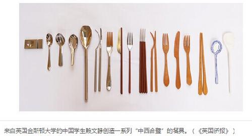 7月11日电 据《英国侨报》报道,一提到东西方文化差异,很多人都会想起就餐文化。近日,一名来自英国金斯顿大学的中国学生试图通过创造一系列“中西合璧”的餐具来融合中西方就餐文化。