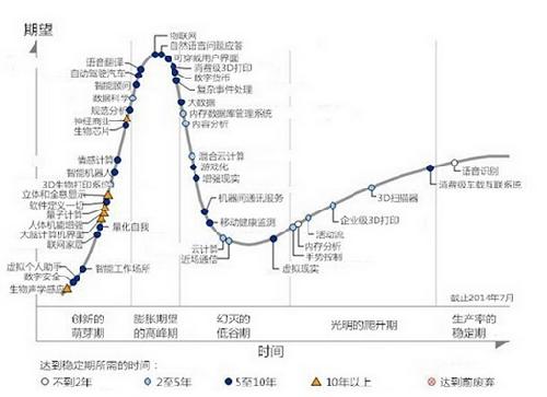 市场调研公司高德纳(Gartner)在上周发布了最新的新兴技术成熟度曲线(Hype Cycle for Emerging Technologies)。去年,大数据享有至高无上的地位,处于高德纳所说的“期望膨胀高峰期”。但现在,大数据已经跌入“幻灭的低谷期”。物联网取而代之,占据了成熟度曲线的最高点。在2012年和2013年,高德纳的分析师们认为,物联网还需要10年以上的时间才会达到“生产率稳定期”。但今年,他们认为物联网只需要5到10年时间就会达到这个最终成熟阶段。高德纳表示:“在我们、我们客户和我们合作伙伴的商业和IT版图上,物联网正成为一个充满活力的组成部分。”
