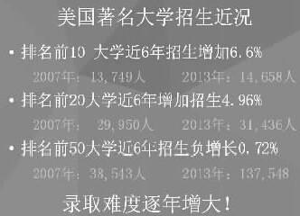 尽管名校录取的竞争越来越激烈,但在生源争夺全球化的背景下,申请留学却变得越来越容易。根据《华尔街日报》对美国联邦数据的分析,在2010年到2012年间,超过1/4的美国四年制私立院校发现,其报考人数下降了至少10%,而在2006年到2009年之间,报考人数出现类似降幅的学校比例不足1/5。