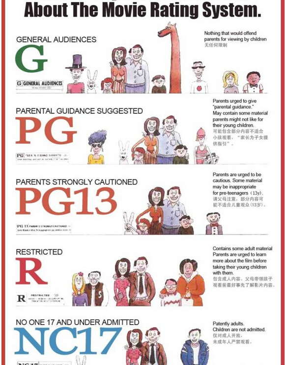 PG级( PARENTAL GUIDANCE SUGGESTED Some material may not be suitable for children.)普通级, 建议在父母的陪伴下观看