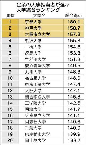 据日本新闻网6月16日报道,这一项问卷是为了了解各大学综合教育和毕业生的情况。根据“对人力”、“思考力”、“独创性”、“智力?学力”等五个项目,对2014年4月进入公司工作的大学毕业生的调查,结果显示,京都大学排名第一,其次是神户大学,第三位是大阪市立大学。