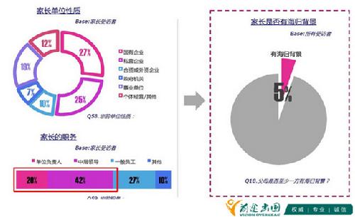在这次白皮书的调查中我们发现,受访的学生家长来自各行各业,分布的层次也更加广泛。数据显示,普通员工身份的家长数量占比排在了第二位,而且绝大多数的家长自己也并不具有海归背景,这表明留学不再是少数富裕或者精英家庭的选择。