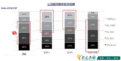 中国学生的留学预算也展现了与当前社会经济发展相当的水平。计划出国读高中和本科的留学预算偏高,尤其是高中已经超过50万以上;计划出国读硕士和博士的留学预算相对偏低,平均水平在50万以下。