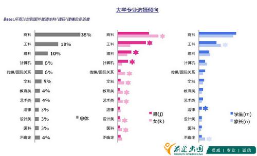 调查中比较出乎意料的是,留学人群在专业的选择上非常理智,家人的期望不再成为他们选专业时的重点考虑因素,取而代之的是自己的兴趣爱好和未来的就业率。尤其是就业因素,已经排到了第二名的位置。