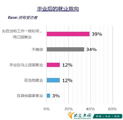 多数有留学意向的学生尚无移民计划。对于毕业后的去向,有51%的学生表示会选择回国就业。这与教育部公布的2014年度留学回国人数的变化趋势不谋而合,2014年度,各类留学回国人员总数为36.48万人。与2013年相比,留学回国人数增加1.13万人,增长了3.20%。