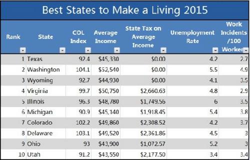 得克萨斯州凭借着低于平均值的生活成本,最大程度地放大了其仅仅略高于平均值的薪酬水平。极低的生产安全事故发生率以及免征个人所得税使得得克萨斯州称霸榜首,而往年的第一华盛顿州则滑落到第二位。