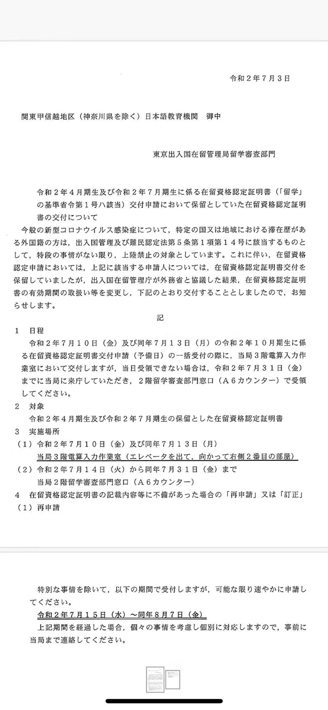 遇上疫情出国留学的计划被打乱,4月生和7月生何时能到日本是大家一直持续关注的问题。关于2020年4月生和7月生的在留资格认定证明书的交付今天语言学校收到来自东京出入国在留管理局留学审查部门的通知,内容如下: