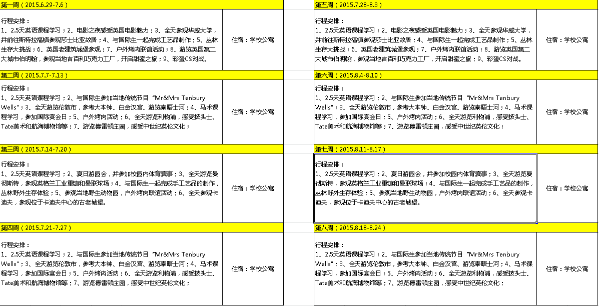 出团日期:2015.6.30-8.24 任意连续两周或以上连续3-8周均可报名,周六/周天出发。