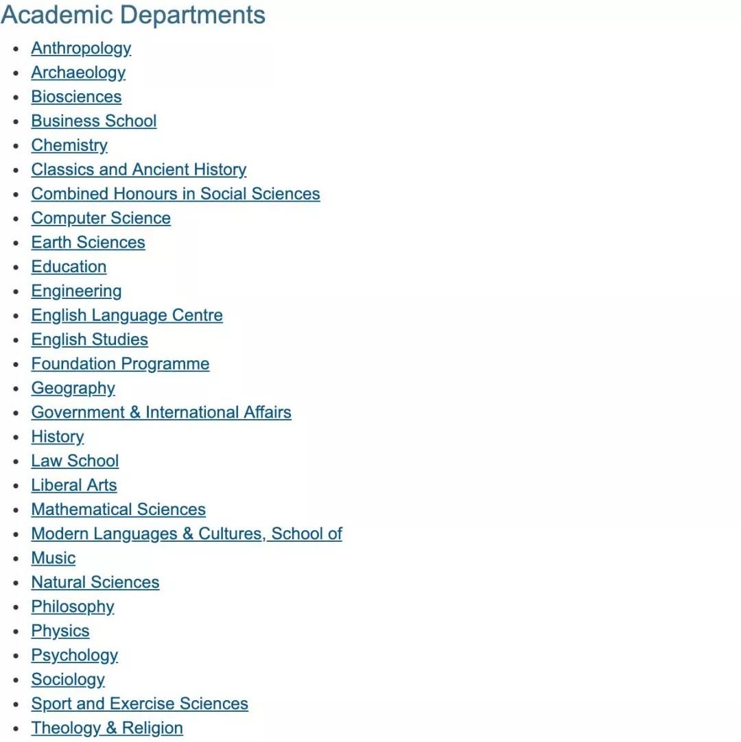 杜伦大学设有艺术与人文,科学,社会科学和健康三个学系,25个学术部门或院校。