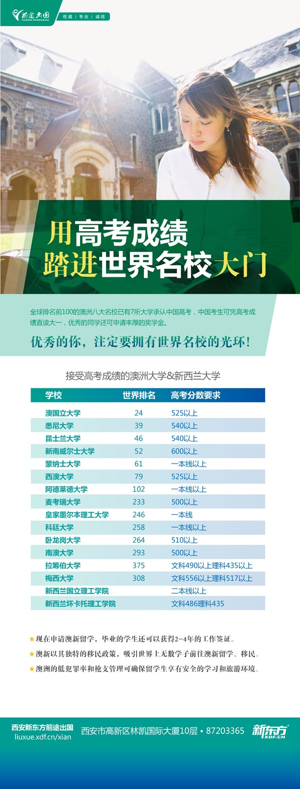 全球排名前100的澳洲八大名校已有7所大学承认中国高考,中国考生可凭高考成绩直读大一,优秀的同学还可申请丰厚的奖学金。