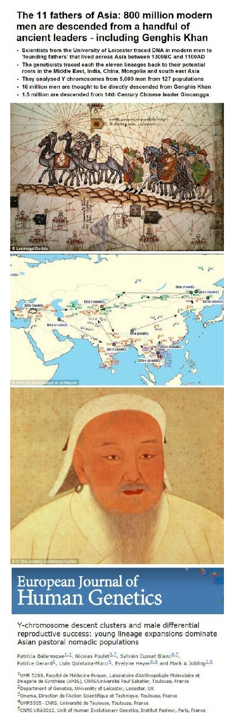 英国莱斯特大学在5321个亚洲男性Y染色体DNA上发现了11个独特序列。表明着11个共同的祖先,其中预测成吉思汗男后代就有1600万。努尔哈赤的爷爷觉昌安的有150万、还有一脉估计来自耶律阿保机。当年11个皇帝爷子的后宫群,现在居然繁衍成8亿了……