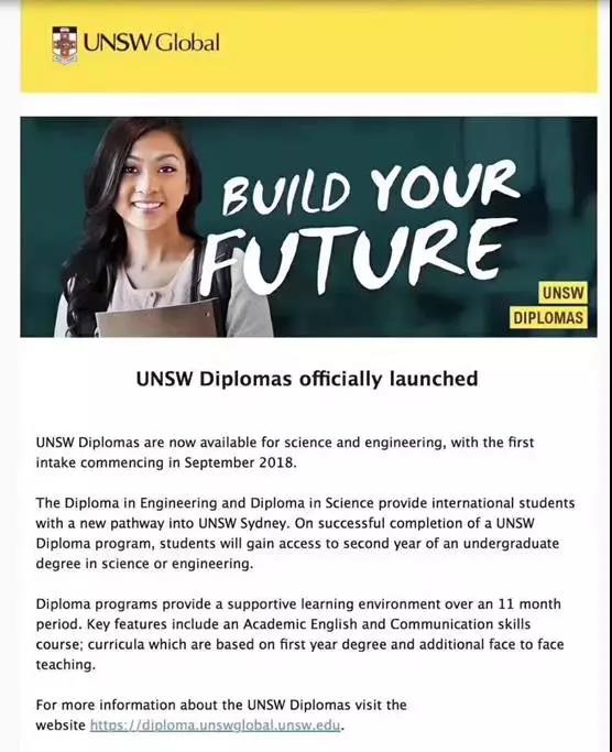 高考不足660分不能直入本科工程的同学们,可以考虑申请新南威尔士大学最新开设的大一文凭课程,2018年9月首次招生,三学期制,九门课。要求高考成绩600分以上,雅思6.0-6.5。 高三的你们加把劲!(相关详情可后台咨询澳洲老师)