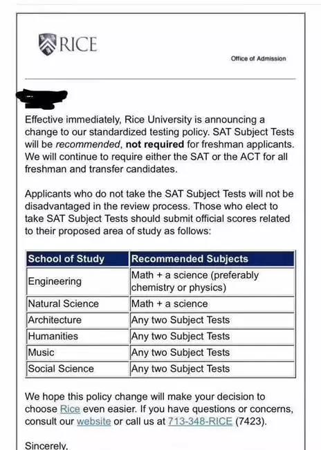 莱斯大学对sat2的新政:不是必须提交啦,改为建议提交了,所提交的科目必须和申请专业相关!