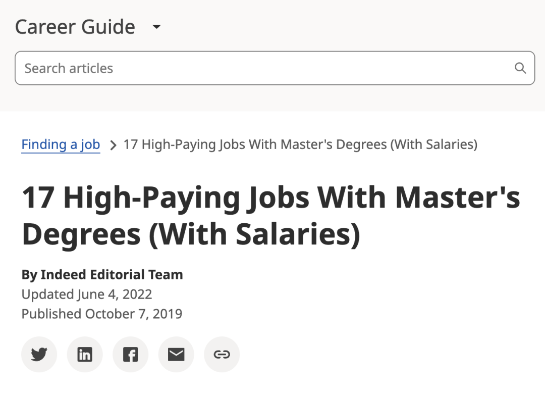 Indeed Salaries根据美国劳工统计局(BLS)、薪酬网站payscale和CNBC的数据,在6月份更新了全美薪资水平高的硕士学位!