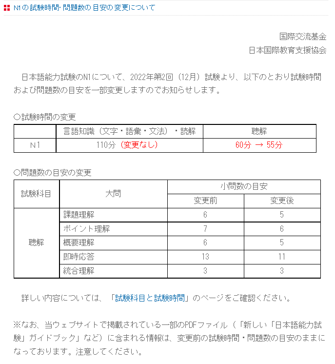 此外,需要年末参与JLPT考试的考生要注意,日本语能力试验官网近日公布了JLPT考试变更的消息。据目前公布内容,将自2022年第2次(12月)考试起,对考试时间和题型数量进行变更: