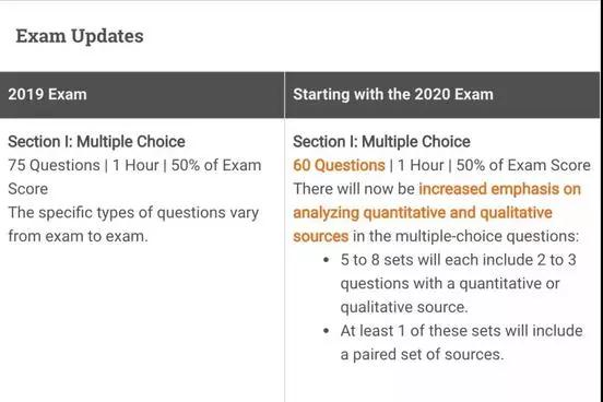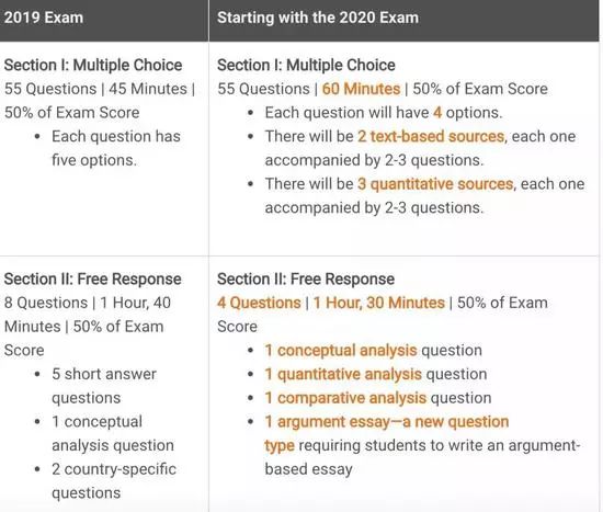 3)FRQ从8个问题缩减为四个,答题时间减少10分钟,问题设置变为:1个概念分析题,1个定量分析题,1个对比分析题,1个新的题型——议论文。